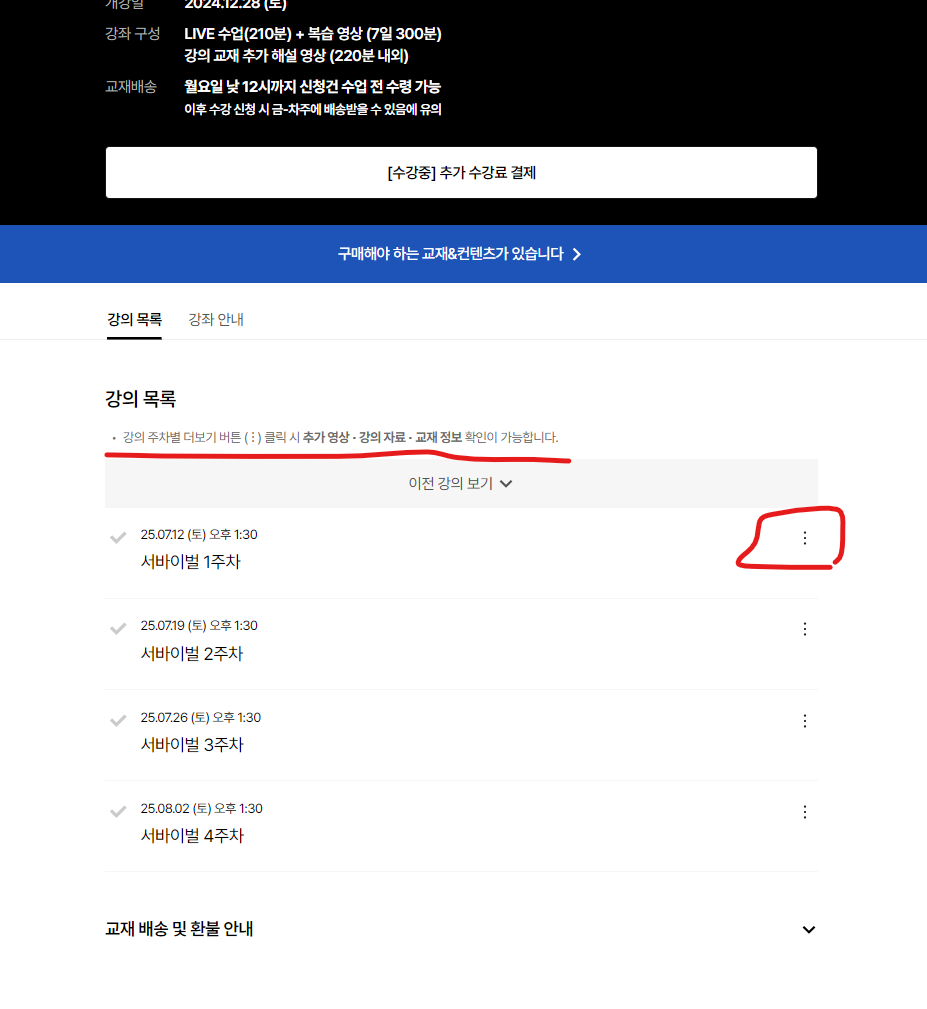 ※ 수업 전, 강의 주차별 ‘더보기(⋮)’ 버튼을 클릭하여